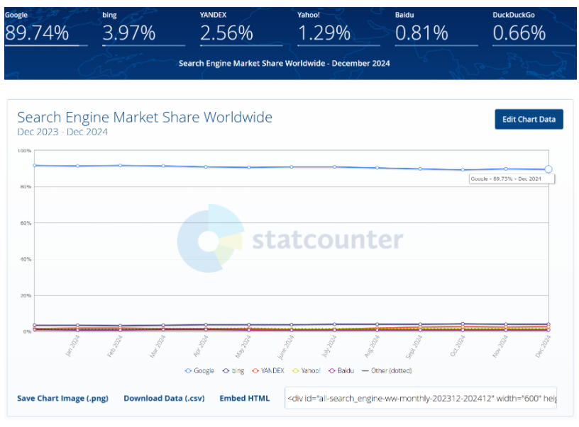 从搜索引擎市场份额来看,谷歌也面临着压力。根据 Statcounter 的最新统计数据显示,2024 年末三个月,谷歌的市场份额分别为 89.34%、89.99% 和 89.73%,这是自 2015 年以来,谷歌市场份额首次未能保持在 90% 以上,预示着其在搜索领域的绝对统治地位开始出现松动,而新兴的 AI 搜索工具正在悄然蚕食其市场份额。